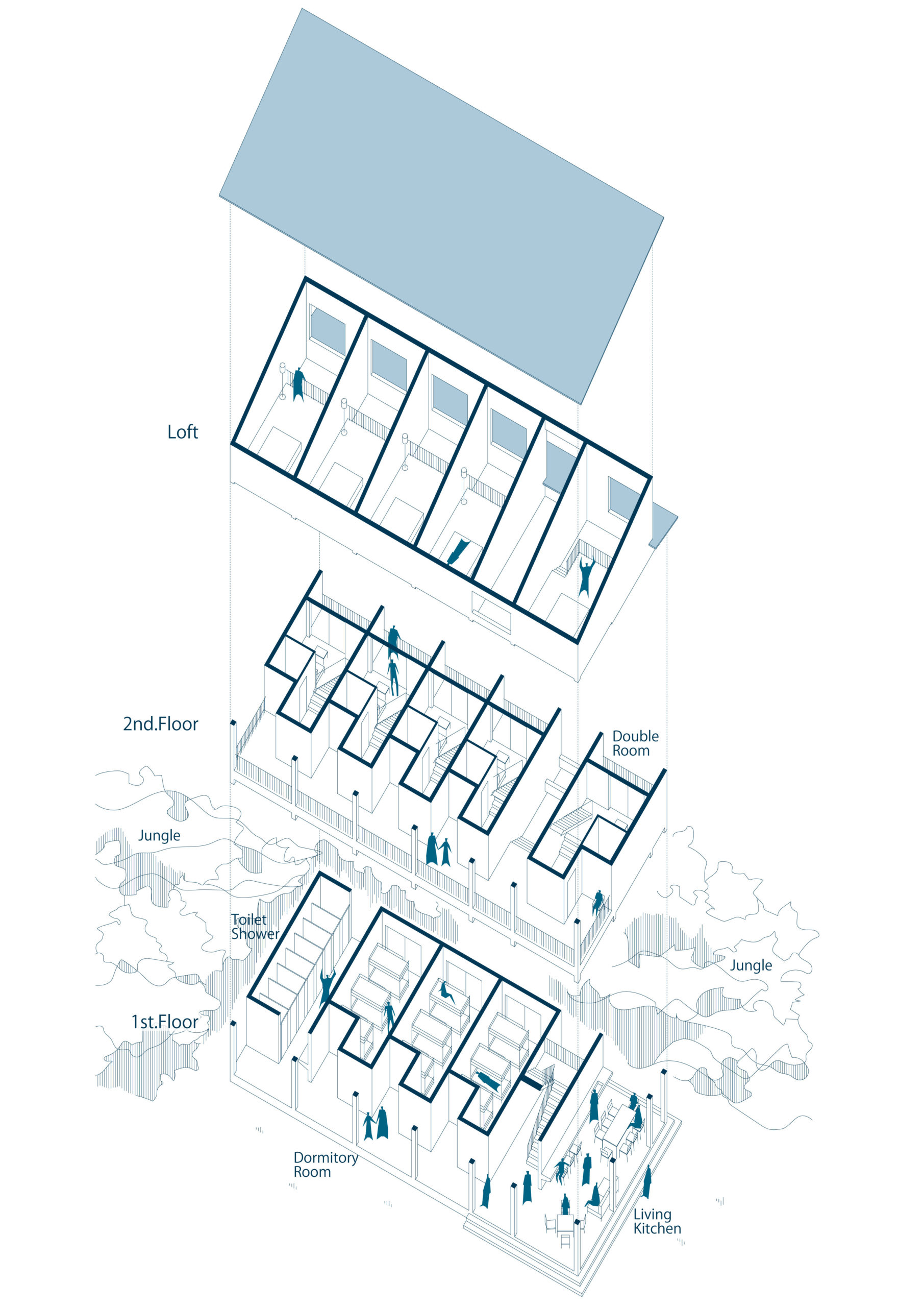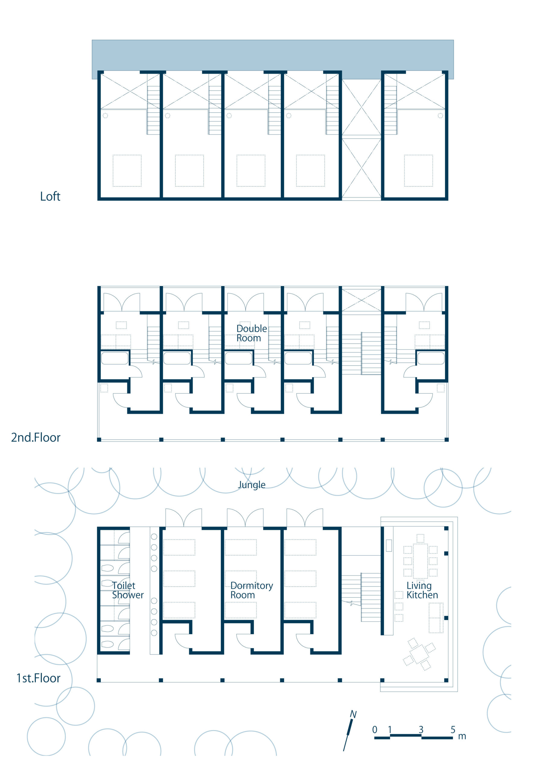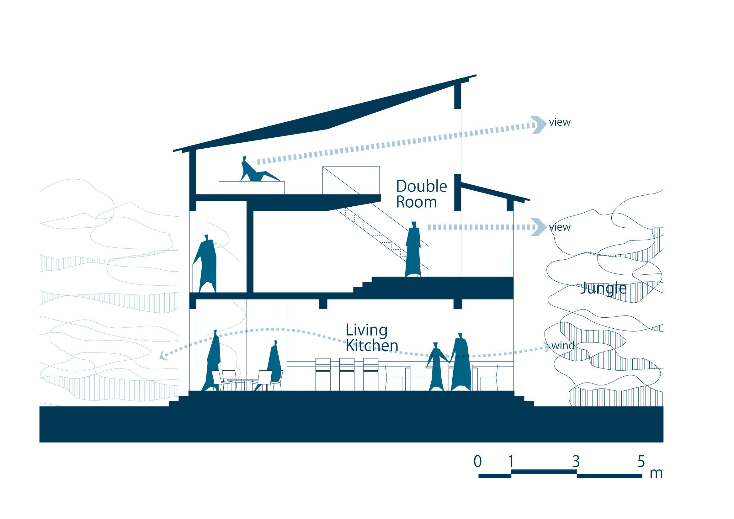 1階には半屋外のリビングキッチンと複数人が宿泊するドミトリールーム、2階はプライベートを重視した個室を設置する構成としている。